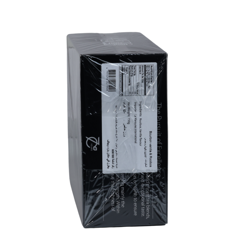 A naturally caffeine-free rooibos tea infused with the rich, creamy notes of bourbon vanilla, delivering a smooth and aromatic cup. Packed in 100 individually foil-wrapped 1.5 g tea bags for lasting freshness.