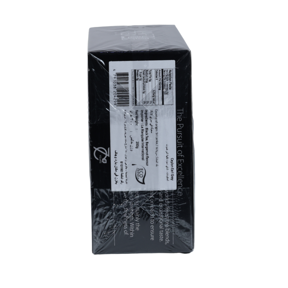 A premium Ceylon black tea delicately infused with bergamot for a fragrant, citrusy flavor, presented in eco-friendly packaging. Packed in 100 individually foil-wrapped tea bags to preserve freshness and aroma.