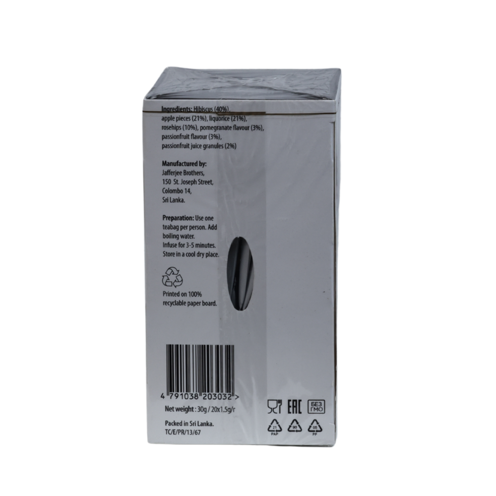 A vibrant, caffeine-free fruit infusion blending the sweet tartness of pomegranate with the tropical flavor of passionfruit. Packed in 20 individually foil-wrapped 1.5 g tea bags to ensure freshness and taste.