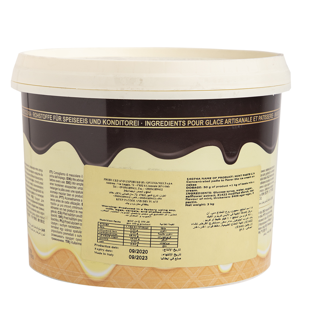 MEC3 Paste Mint (No Color) 3 Kg A high-quality, semi-finished paste with a natural mint flavor and no added color, perfect for creating fresh, aromatic artisanal gelato and pastry products. Offers a clean, refreshing taste with a naturally green appearance. Ideal for professionals seeking a pure mint profile without artificial coloring.