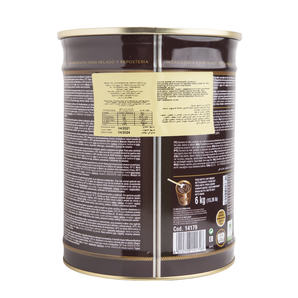 MEC3 Variegato Quella 6kg A smooth, brown spreadable cream with rich hazelnut and cocoa flavor, perfect for enhancing gelato, pastries, and desserts. Ready to use straight from the tin, it delivers indulgent taste and creamy texture for a variety of sweet applications.