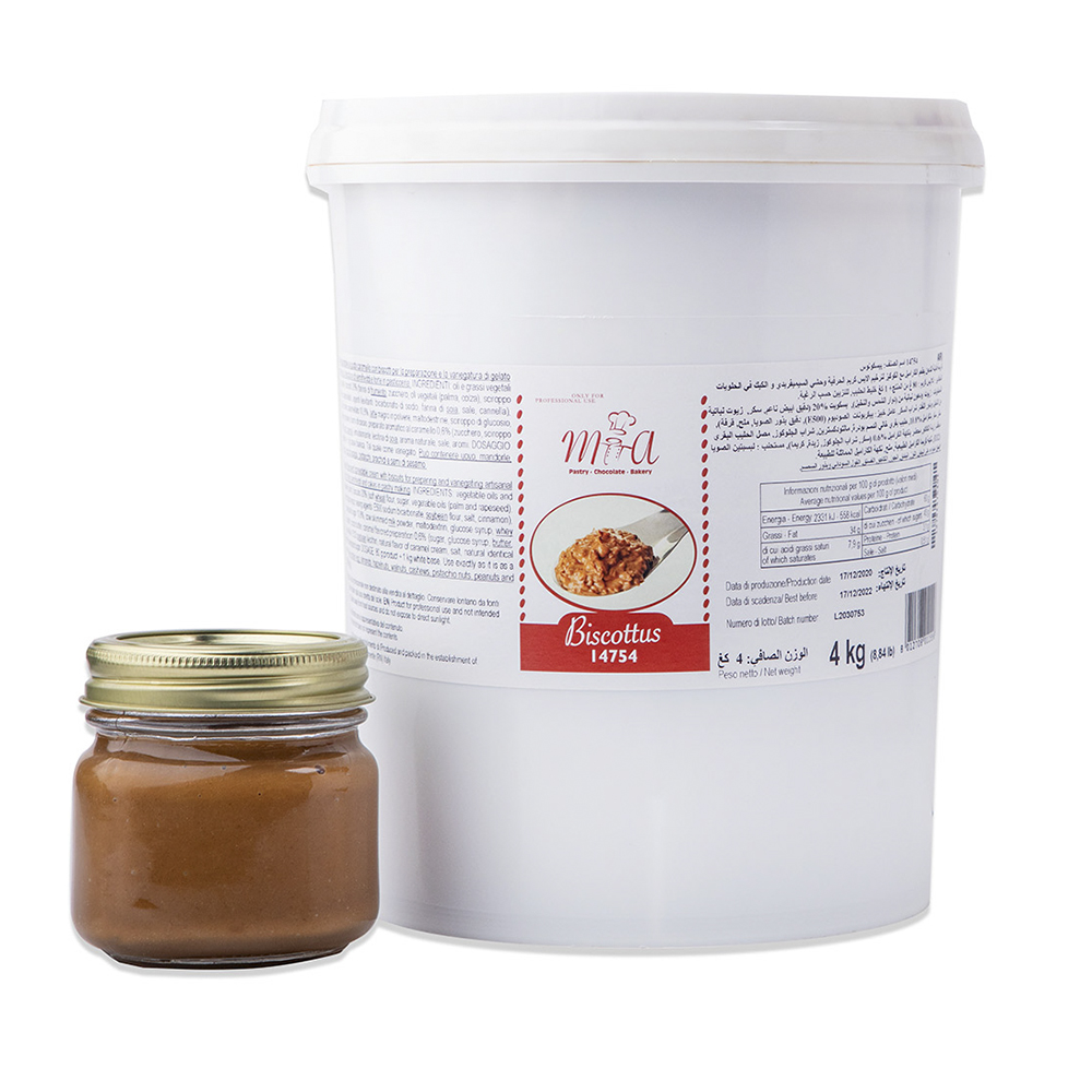 MIA Biscottus Filling is a spreadable caramel-flavored cream enriched with biscuit pieces, designed for professional pastry and gelato applications. This 4 kg product is ideal for variegating gelato, filling semifreddi, and layering cakes.